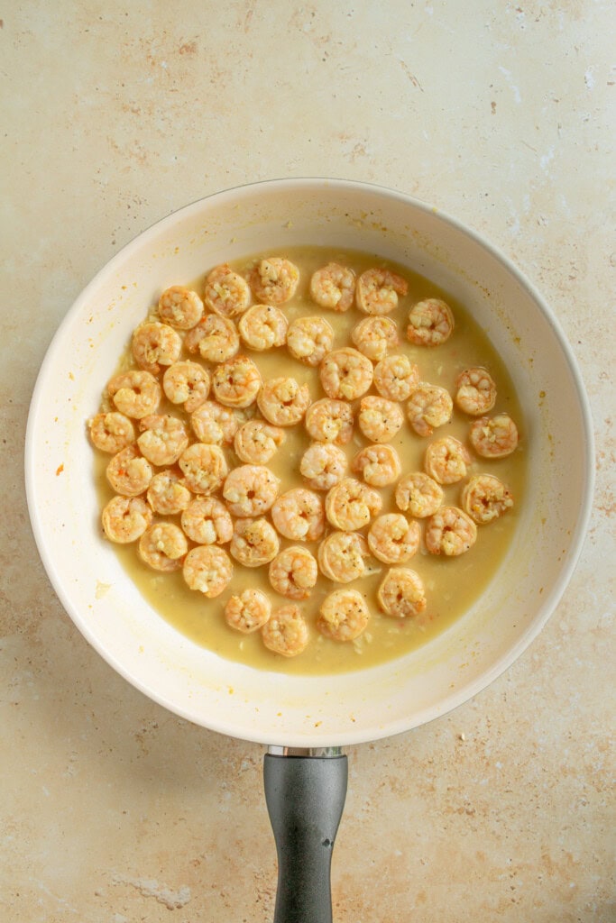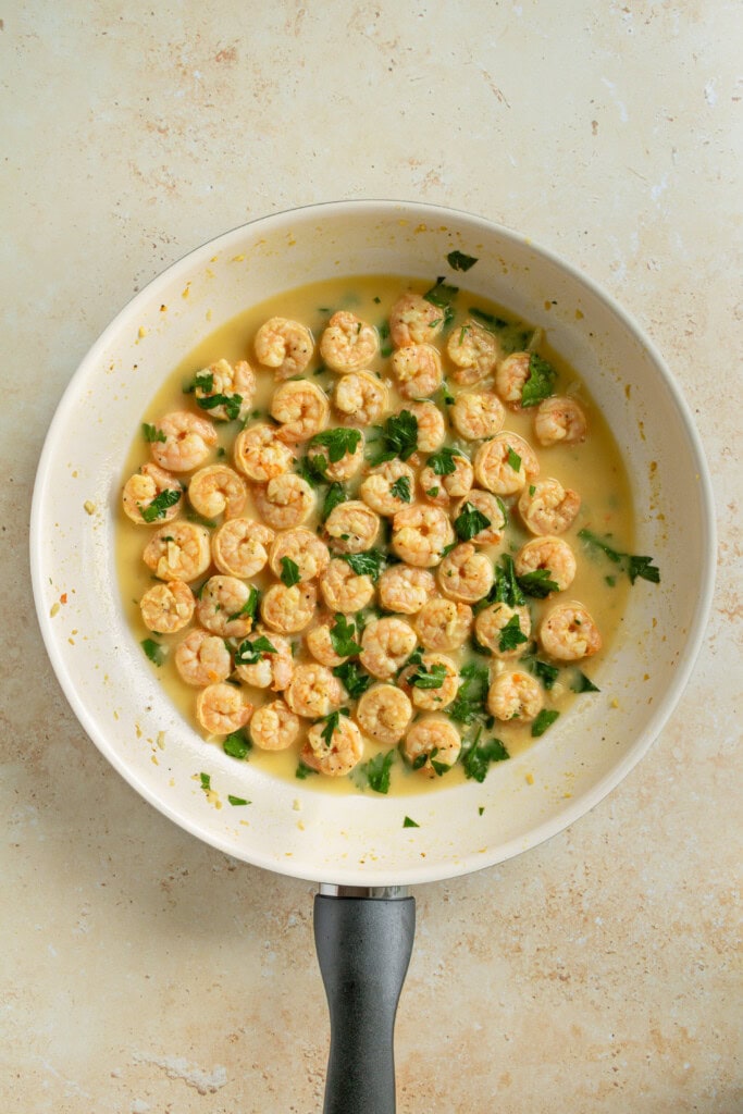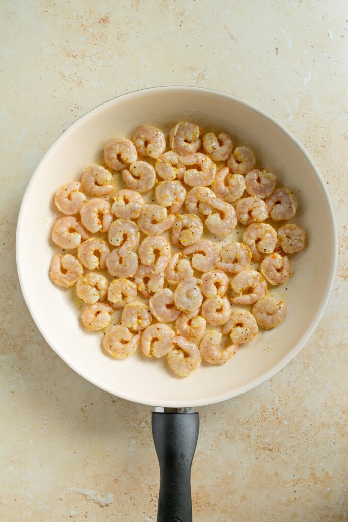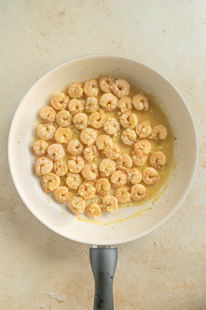 - If the pan seems dry, add another spray of olive oil. (The shrimp will still be in the pan).