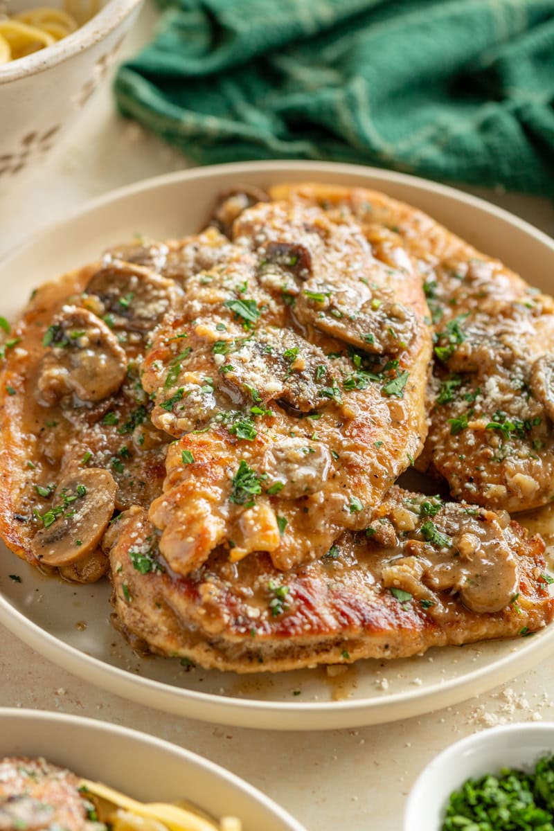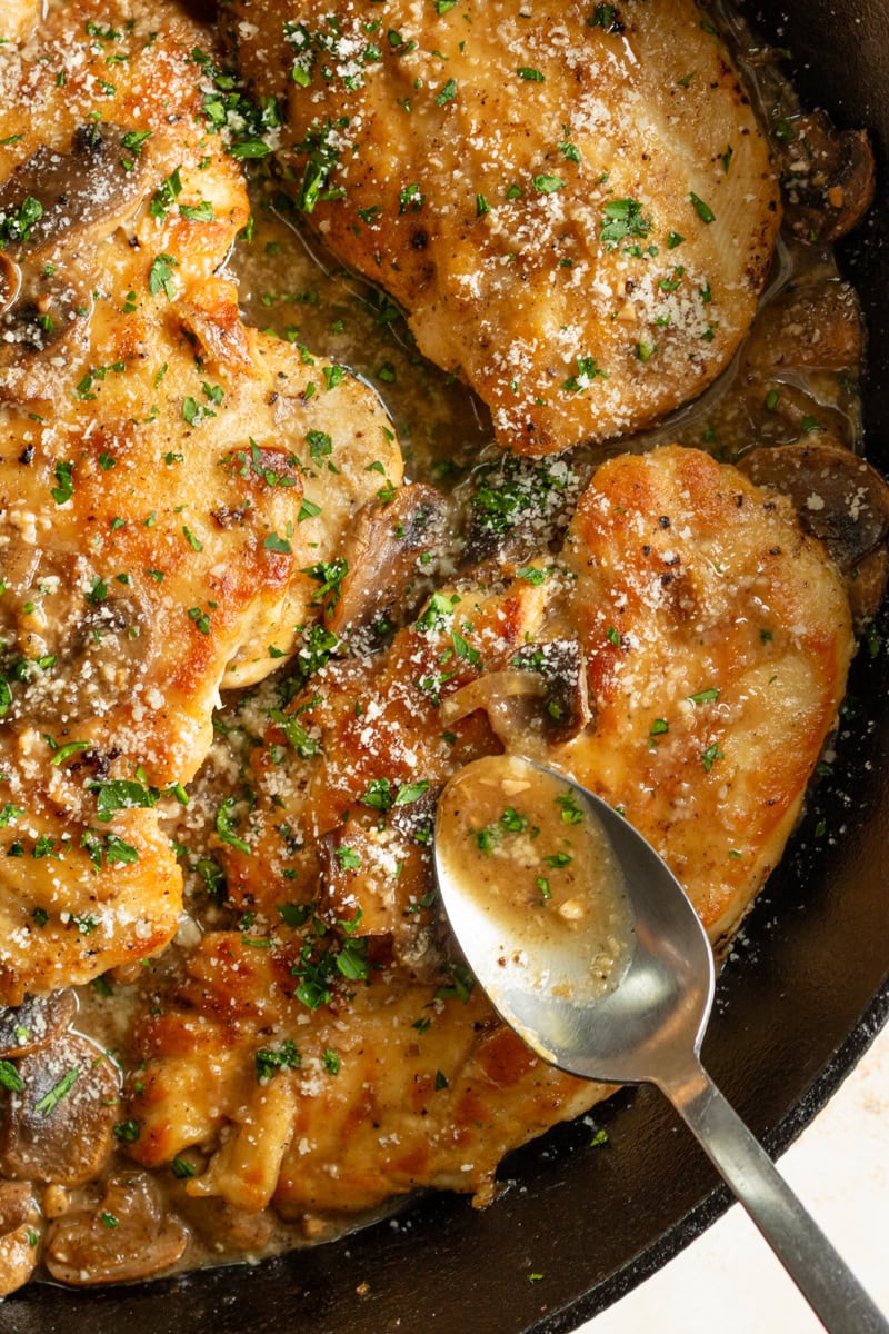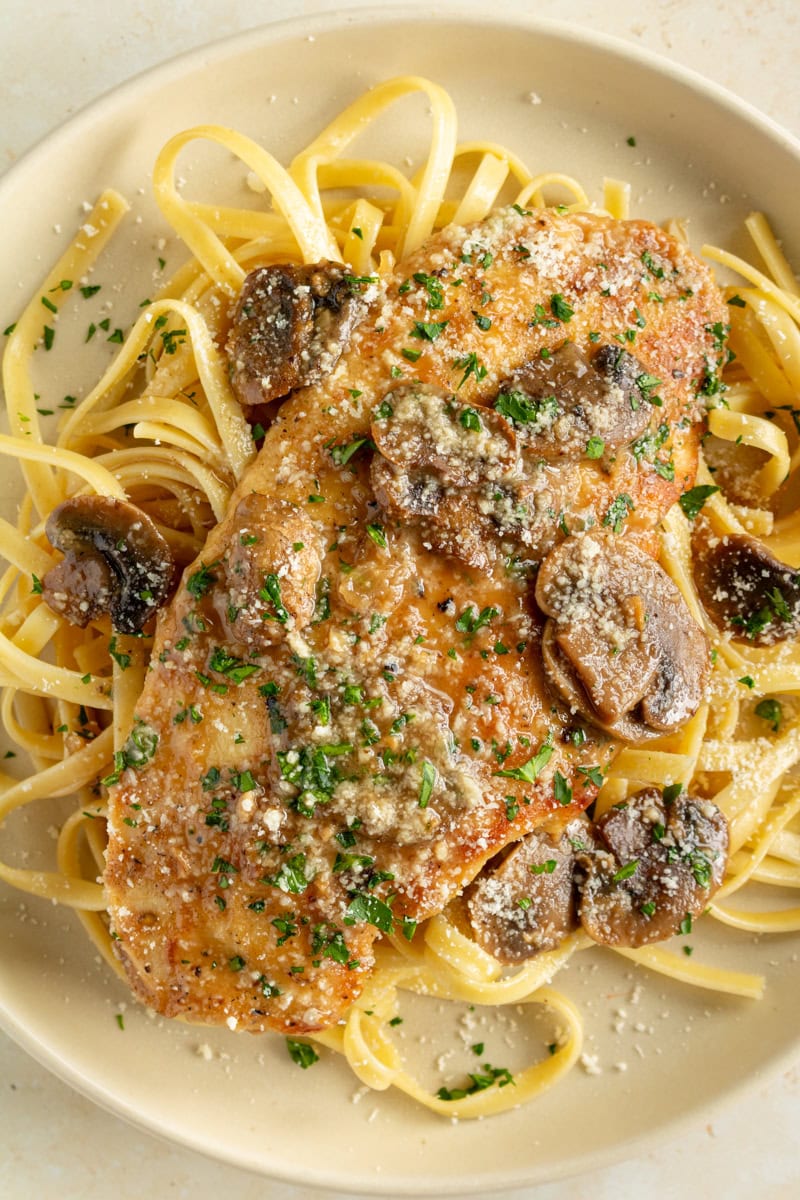I always recommend using real wine for cooking; in other words, something you would drink. That’s the flavor that will permeate your dish, and I do believe it makes a difference. That being said… I realize life gets in the way, who has time to bounce from the supermarket to the liquor store just to make a recipe for dinner? Or maybe you don’t want an entire bottle of Marsala wine in your fridge that you won’t use for anything else. …and that’s why they sell cooking wine. Right in the supermarket where they sell the oil and vinegar. I used cooking wine for this recipe, and it came out great! Can I omit the wine? In most recipes, you can sub out wine for chicken broth. But not for this one, sorry! The Marsala wine is what makes this chicken Marsala.