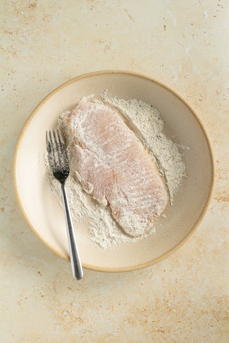 - Place the flour in a shallow bowl with 1/2 tsp of kosher salt and fresh cracked pepper.