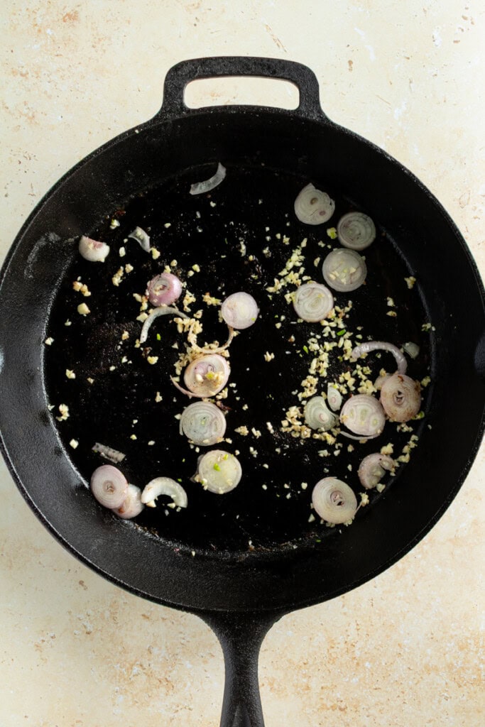 - To the same frying pan, add more olive oil spray and the shallots and garlic.