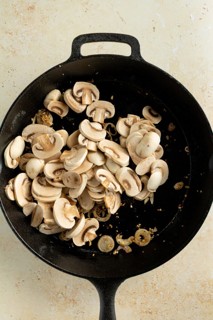 Cook the shallots and garlic for just a minute; this is important so that you don’t burn the garlic. Next, add the mushrooms. Toss them around a bit and then place the lid on the pan.