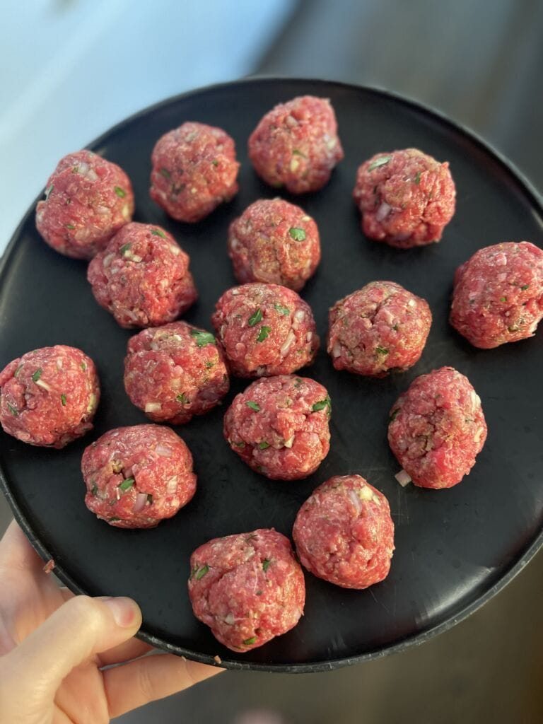 - Form into 16 equal sized meatballs by gently rolling the meat using your hands.