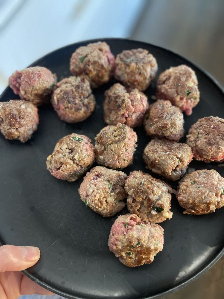 - The meatballs will not be cooked through at this point, but remove them from the pan and set aside on a plate to rest.