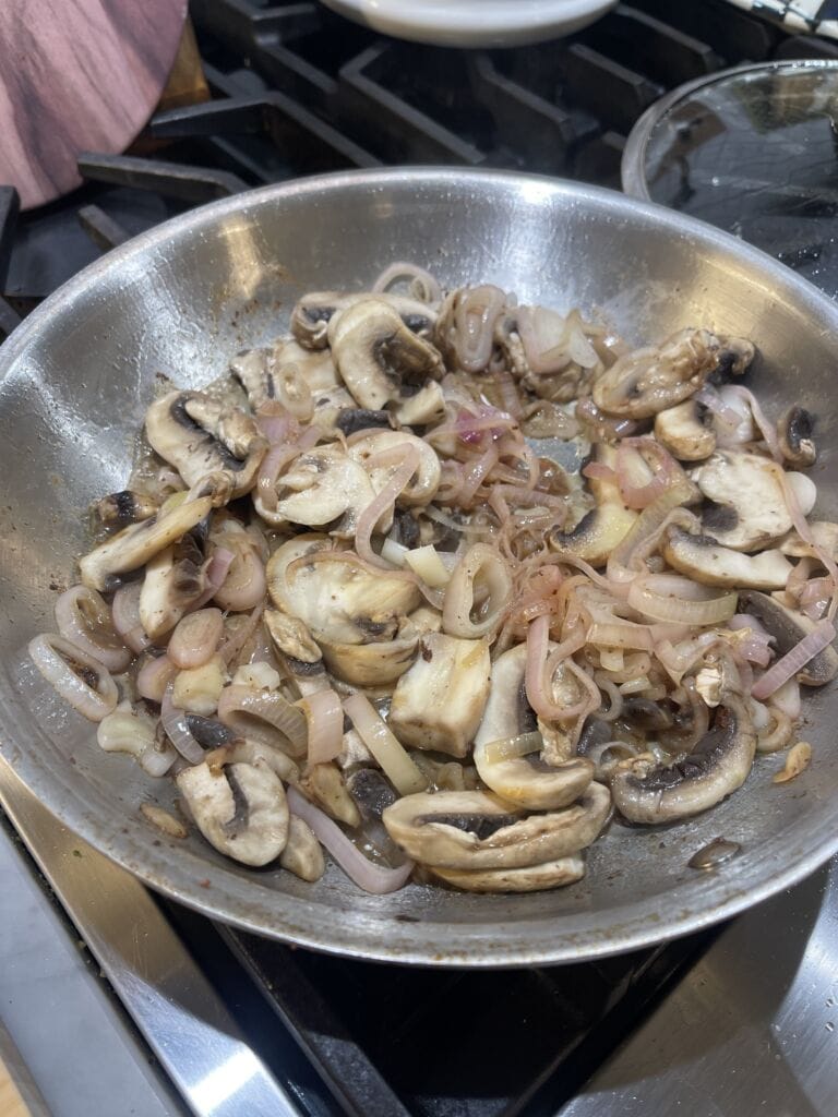 - In the same frying pan, add more olive oil spray, along with the sliced shallots and mushrooms.