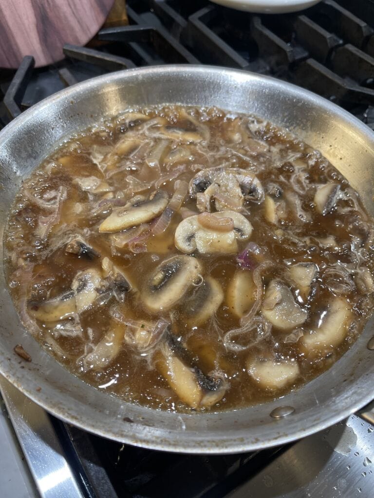 In the same frying pan, add more olive oil spray, along with the sliced shallots and mushrooms. Saute the vegetables over medium high heat, covering the pan intermittently so that the vegetables steam and cook down. Cook the vegetables for about 10 minutes or until they are tender, and slightly caramelized, golden brown in color. Next, add the sherry to the pan and use a wooden spoon to pick up any burnt bits on the bottom of the pan. Simmer the wine for about 5 minutes over medium heat until it cooks down slightly and the alcohol evaporates.