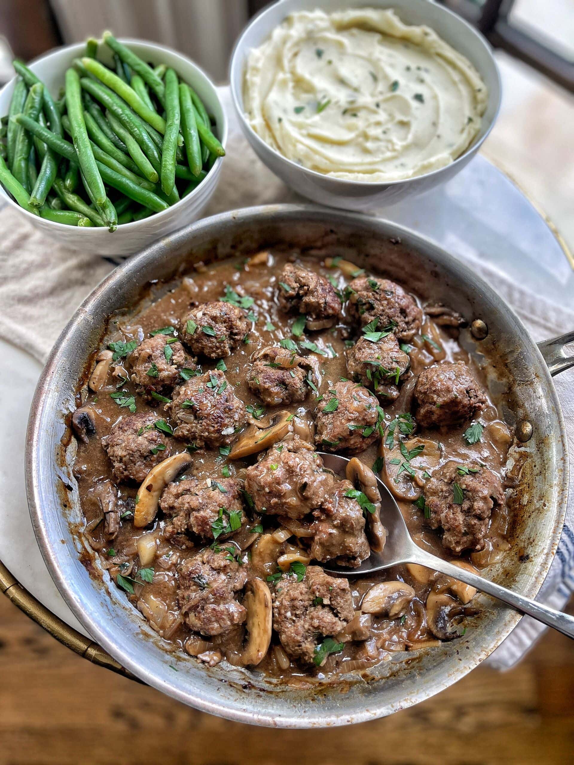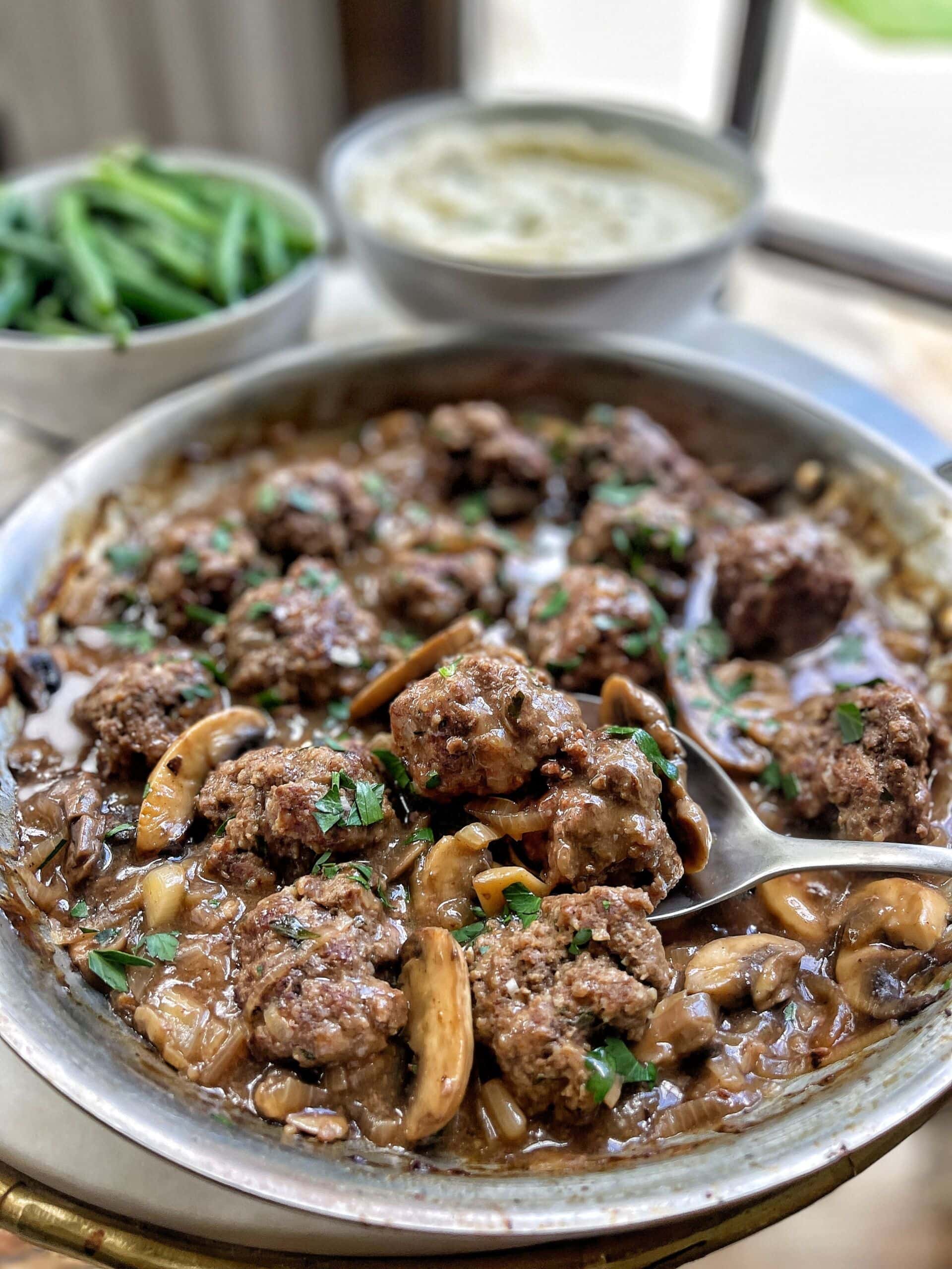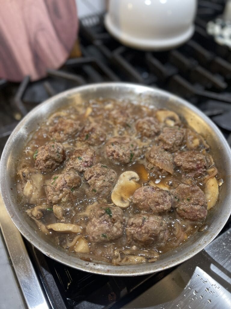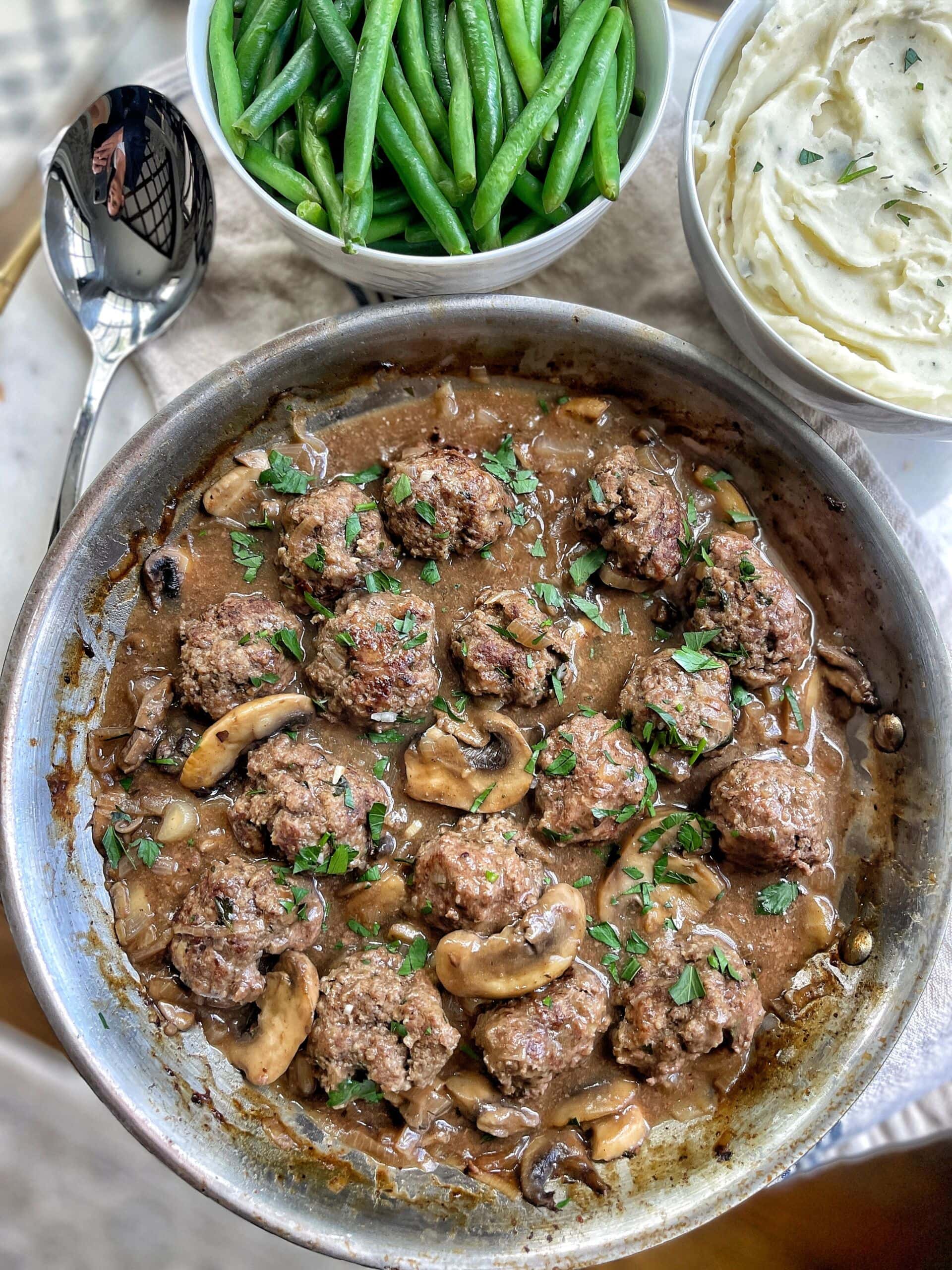 Lightened-Up One Pan Beef Meatballs with Mushroom Gravy