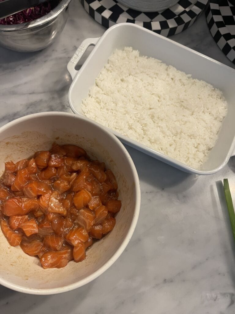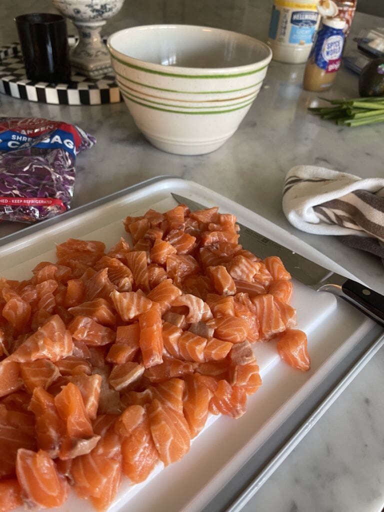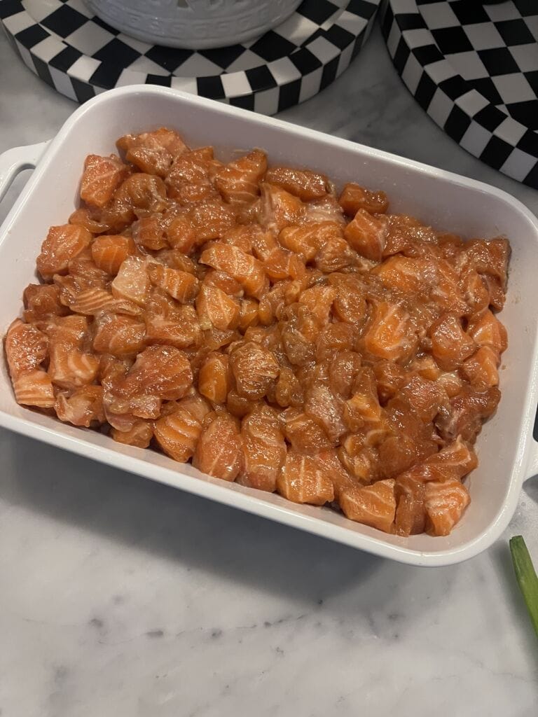 - Cube salmon into small pieces, and add to the bowl of marinade. Toss to coat.