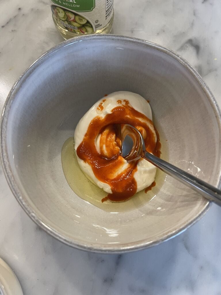- Combine the light mayo, sriracha, remaining sesame oil and rice vinegar in a bowl.