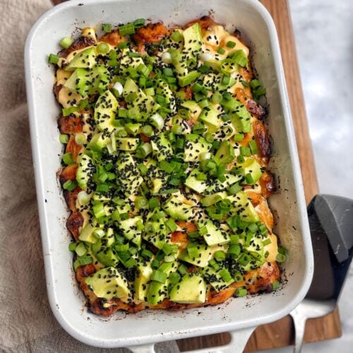 I was inspired by an Instagram reel I saw from @kalejunkie – her sushi bakes all look amazing and I had to try my own lightened up version! Since the main ingredients are all healthy on their own, it was really about just fine tuning the measurements to keep the calorie count as reasonable as possible.