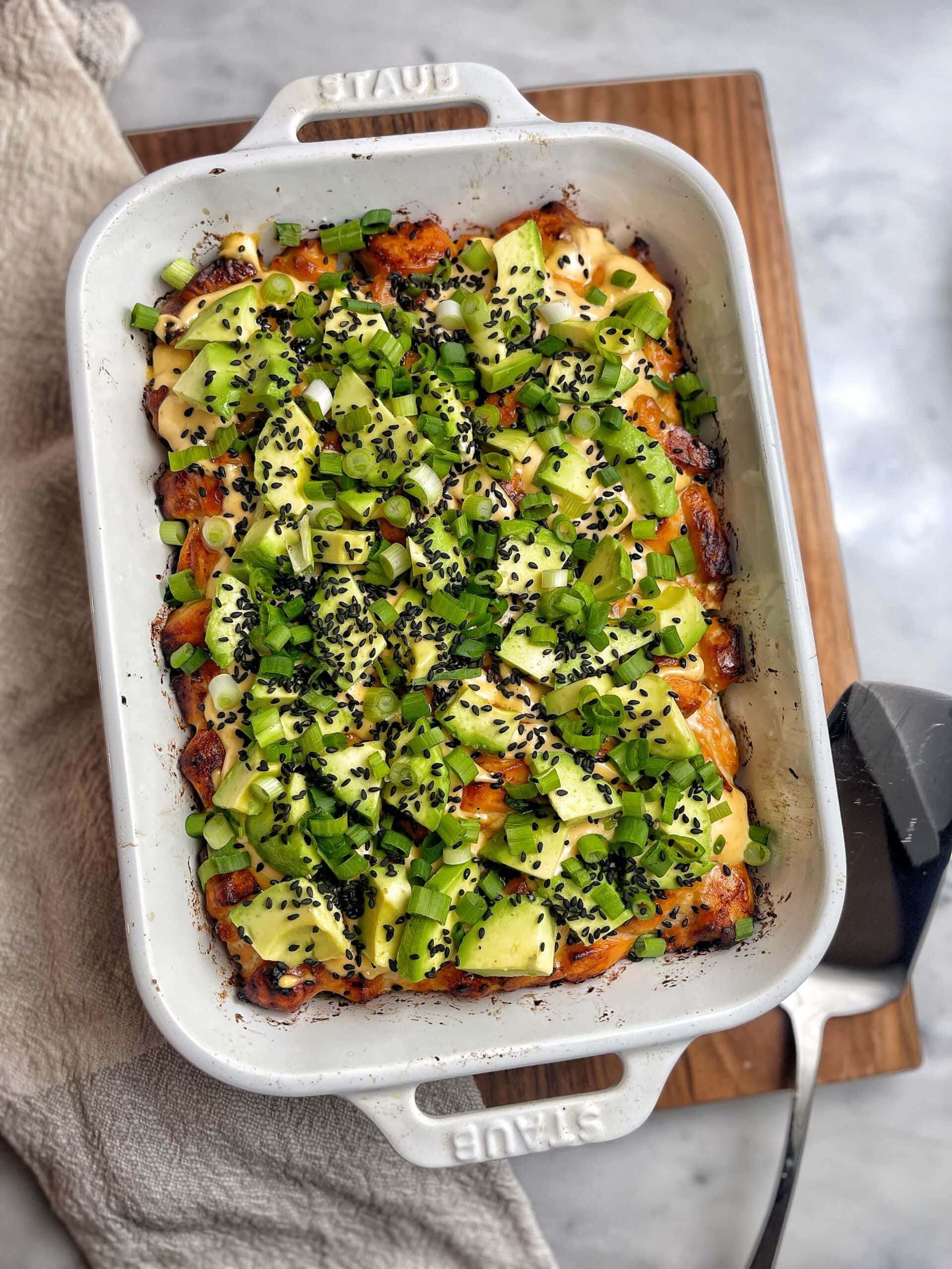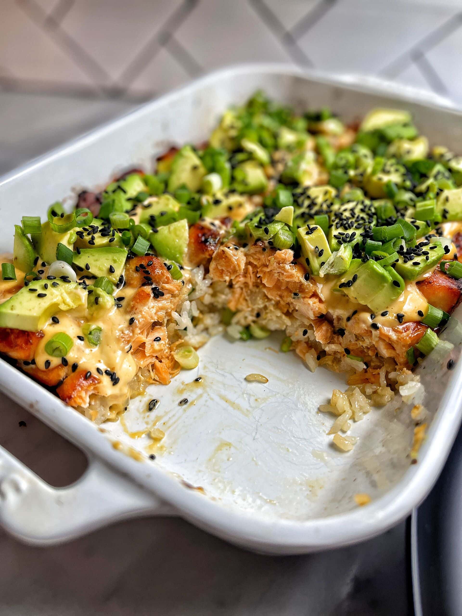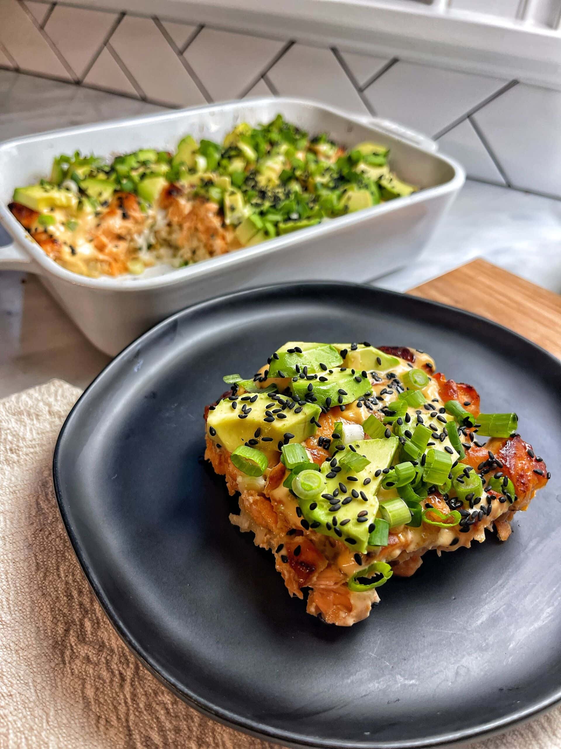 - Drizzle sushi bake with spicy mayo and garnish with avocado slices, scallions and seasme seeds.